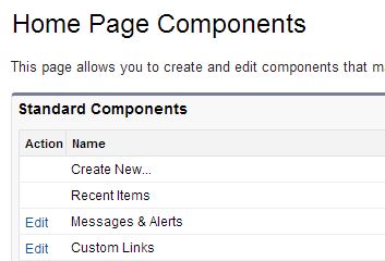 Now that you have your secret code to your custom object it’s time to create a custom link. Go to Setup>>Customize>>Home>>Home Page Components and click {Edit} next to “Custom Links”