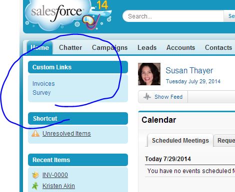 Now I make sure my “Custom Links” are displaying on the home page layout by going to “Home Page Layout” edits. I check the box next to “Custom Links” to display and indicate the order the narrow components should be in.